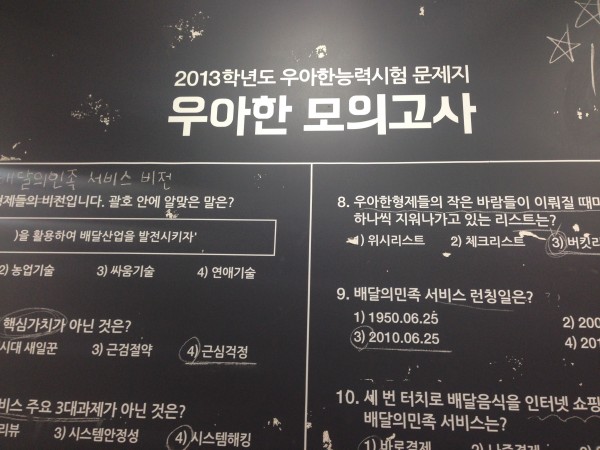 배달의민족 소셜에디터 발대식을 위해 우아한형제들 사무실에 들어서니 먼저 벽면에 ‘우아한 모의고사’가 눈에 띄었다. 회사의 비전과 사명, 서비스에 대해 시험지 형식으로 만든 것이었다. 사무실 구석구석에 ‘같은 내용이라도 더 재미있게’라고 외치는 물건들이 가득했다.