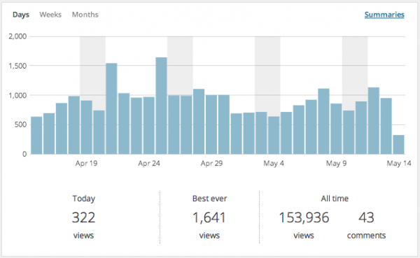 3월 이전까지는 일 평균 400 뷰를 왔다갔다 했었다. 그러던 것이 4월부터는 두 배 가량 늘었고 날짜에 따라서는 1,500을 넘기기도 했다. 특히 지난 달에 올린 세 개의 글이 꾸준히 트래픽을 올려주고 있다. 하루 300 뷰 정도가 이 세 개의 글에서 나온다.