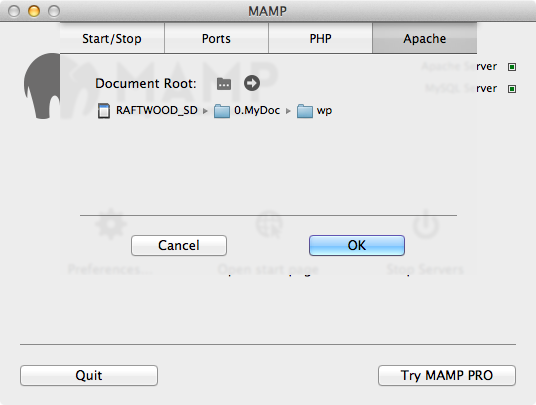 맨 왼쪽의 ‘Prefernces…’를 누르면 아래와 같이 설정 창이 열린다. PHP 나 포트 설정을 변경하거나, 아파치 Document Root를 변경할 수 있다. 나는 워드프레스를 설치하기 위해 생성한 폴더를 지정했다. 기본 포트는 아파치는 8888, MySQL은 8889다. 이는 변경하지 않고 진행했다.