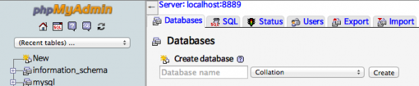 워드프레스 테스트 사이트를 만들기 위해서는 먼저 데이터베이스를 만들어야 한다. phpMyAdmin에서 ‘Databases’ 탭을 클릭하면 생성할 수 있다. 내 경우는 wp1이라는 이름으로 만들었다.