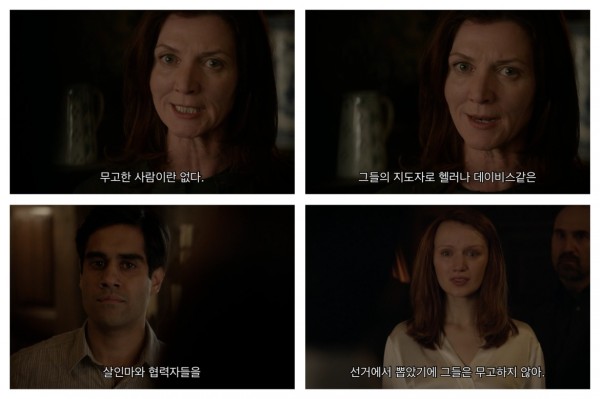 정보기술이 얼마나 발전했는지는 천천히 보기로 하고(…) 3화를 보면서 기억나는 장면 하나만. 아래 대사를 말하는 ‘마고’는 이번 시즌 9의 주된 악역이자 테러리스트. 아래쪽 남자는 사위, 오른쪽 여자는 딸이다. 사위가 무고한 사람들을 죽일 수 없다고 하자 이렇게 말한다.