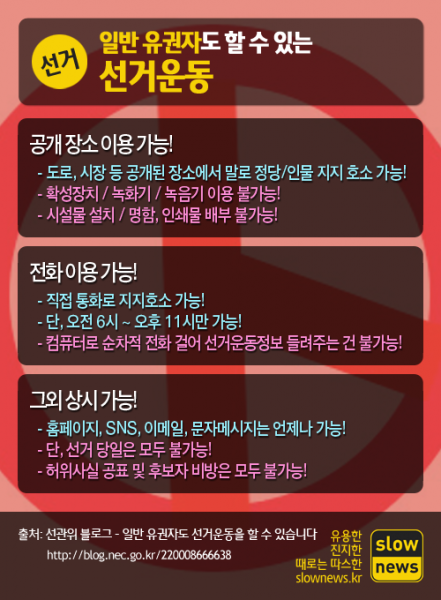 이 결정 이후 인터넷 선거운동은 더는 위법이 아니다. 2014년 6월 4일 제6회 지방선거가 2주도 채 남지 않았다. 이 기간에 인터넷 선거운동을 포함해 일반 유권자가 할 수 있는 선거운동 방법을 알아보자.