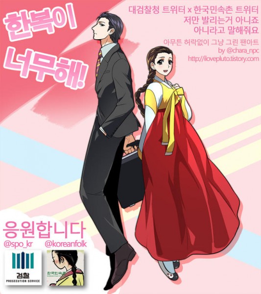 “한복이 너무해”는 바로 이 사건(?)을 계기로 만들어진 웹툰이다. 작중 젊은 엘리트 검사인 대검이, 늘 한복을 입고 사극 말투를 쓰는 소녀인 속촌이 또한 두 계정의 캐릭터에서 따온 것이다.
