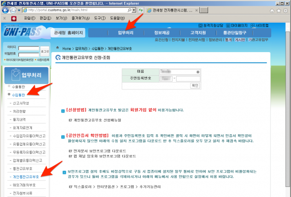 관세청 전자통관시스템에 정상적으로 접속했다면 [업무처리 – 수입통관 – 개인통관고유부호] 순으로 메뉴를 찾아 들어간다. 그리고 이름과 주민등록번호를 넣고 ‘확인’을 누르면 공인인증서를 확인하는 과정을 거치게 된다.