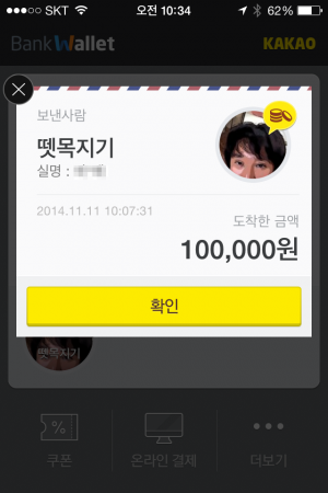 상대방의 뱅크월렛 카카오 앱에는 내가 보낸 송금 내용이 아이콘으로 표시된다. 이 아이콘을 클릭하면 나의 실명과 금액을 함께 보여준다. 확인을 눌러 수령 절차를 진행할 수 있다.