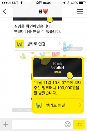 위에서 말했듯이 뱅크월렛에 등록하기 전에 받은 돈을 받을 때는 송금한 사람이 확인하는 절차가 한 번 더 있다. 뱅크월렛을 이미 등록한 상태에서 송금받은 돈을 받으면 바로 내 뱅크월렛에 잔액이 채워진다. 그리고 카카오톡으로는 상대방에게는 잘 받았다는 메시지가 전달된다.