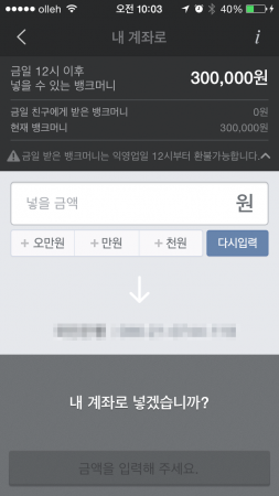 - 남에게 받은 돈은 다음 날 12시가 지나야 내 계좌로 넣을 수 있다.