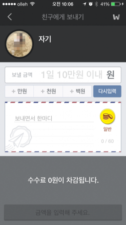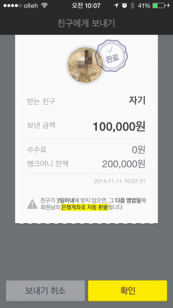 메인 화면에서 ‘보내기’ 버튼을 누르면 카카오톡 친구 중에서 대상을 고를 수 있다. 한 번에 한 명만 가능했다. 아내를 호출하여 송금 테스트를 해봤다. 송금은 ‘1일 10만 원 이내’라는 안내문이 나온다. 금액과 송금 메시지를 적어 간단하게 보낼 수 있었다. 아직은 수수료가 붙지 않는다.
