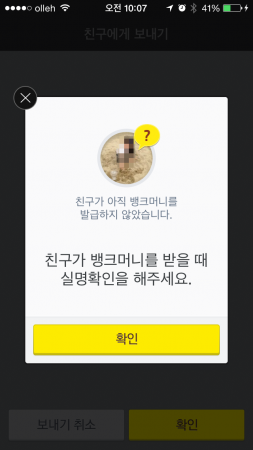 송금하고 나면 ‘친구가 뱅크머니를 받을 때 실명확인을 해주세요’라는 메시지가 나온다. 나중에 보니 상대가 내가 보낸 돈을 받을 때, 나에게 다시 한 번 상대방의 실명을 확인하는 절차가 있었다. 이 절차는 뱅크머니에 등록하지 않은 상대에게 송금할 때만 진행되고 등록한 상대에게 보낼 때는 생략된다. 이때는 송금 전에 상대방의 등록된 실명을 확인할 수 있기 때문이다.