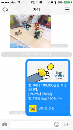 이렇게 송금을 끝내고 나면 카카오톡을 통해 송금한 내용과 뱅크월렛 카카오를 실행할 수 있는 링크가 상대방에게 전송된다.