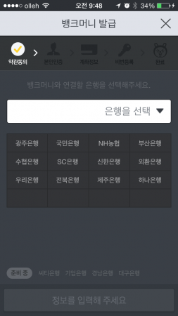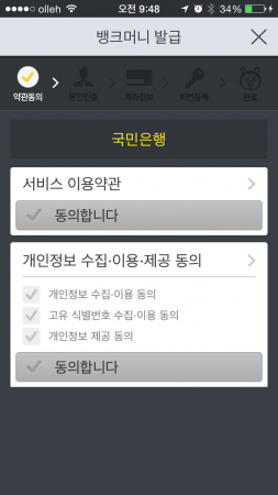 은행을 선택하니 이번에는 은행의 서비스 이용약관이 나온다. 두 약관 모두 끝까지 읽어보지 않고 체크만 해도 다음 단계로 진행할 수 있었다.