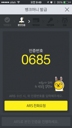 그 누구도 피해갈 수 없는 무시무시한 실명 인증이 나왔다. SMS로 인증번호만 받으면 끝인 줄 알았는데 그게 아니었다. ‘ARS 전화요청’을 눌러 전화가 오면 저 인증번호를 또 눌러줘야 한다. 이 과정을 마치면 계좌번호와 계좌 비밀번호를 입력할 수 있다.
