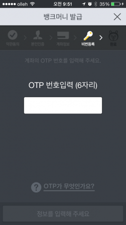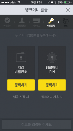 아직도 끝나지 않았다. 비밀번호를 등록해야 하는데 무려 두 개를 등록해야 한다. ‘지갑 비밀번호’는 앱을 실행할 때 묻는 6자리 비밀번호다. 뱅크머니 핀은 송금 등 실제 돈이 오갈 때 입력하는 4자리의 비밀번호다. 이 두 번호를 설정하고 나면 OTP 번호를 묻는다. 평소 금융 거래에 OTP가 아닌 보안카드를 쓰는 사람이라면 보안카드 번호를 입력하게 할 것이다.