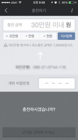 충전 금액은 ’30만 원 이내’라고 표시되고, ‘국민은행 뱅크머니 최소충전 금액은 1,000원입니다.’라는 메시지가 나온다. 1회 충전 가능 금액은 30만 원이고 최대 충전 가능 금액은 50만 원이다. 최소 충전 금액은 은행마다 다르지만 보통 1,000원이다.