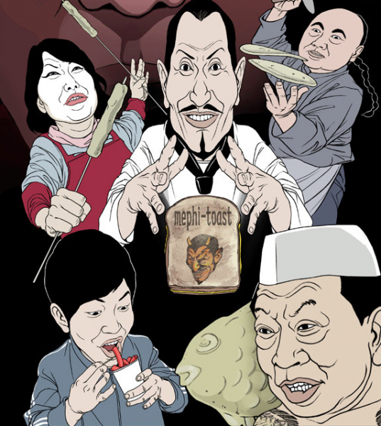 웹툰 “노점 묵시록” 또한 음식과 대결이 주가 되지만 그뿐만이 아니다. 고급이거나 하다못해 식당 음식도 아닌 떡볶이, 붕어빵, 오뎅 같은 노점 음식을 소재로 한다는 점도 특이하지만 끊임없는 패러디와 소위 병맛의 향연이 독자들을 끌어당기는 작품이다.