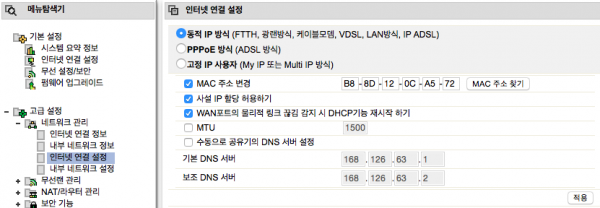 [고급 설정-네트워크 관리-인터넷 연결 설정] 메뉴에서 공유기의 맥어드레스를 변경할 수 있다. ‘MAC 주소 변경’ 항목을 체크하고 ‘MAC 주소 찾기’ 클릭하면 현재 연결된 무선 장비들의 맥어드레스를 보여주는데, 그중 하나를 선택했다. 즉 내가 사용하는 장비 중 하나의 맥어드레스를 공유기에 설정해주는 것이다. 지금까지 세 번 이런 증상이 있었고, 그때마다 아이폰 5 -> 맥북 -> 아이폰 6의 맥 어드레스로 돌려막기(?)해 설정해 주었다.