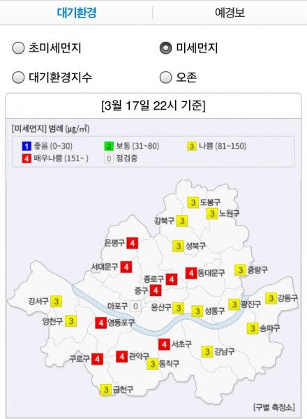 요약하자면 초미세먼지 예보 사이트를 활용하고, 실내에선 창문을 꼭 닫고, 외출 후엔 잘 씻고, 대중교통을 이용하고, 초미세먼지 차단 마스크를 쓰고, 그린피스에 후원하라는 내용이다. 기승전후원(…). 서울의 경우 모바일 서울 환경 사이트에서 자치구별 현황과 예보를 볼 수 있다. PC버전도 있는데 모바일 버전이 훨씬 더 보기 편해서 따로 링크는 걸지 않았다.