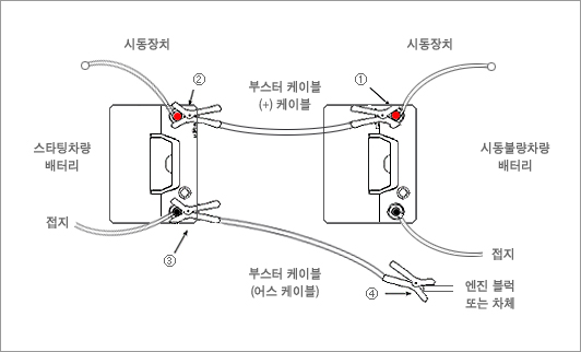 - 어지간하면 같은 종류의 차량으로 점프 스타트를 시도하자( 일반적으로 디젤 차량과 가솔린 차량은 배터리 전압이 다르다. ).