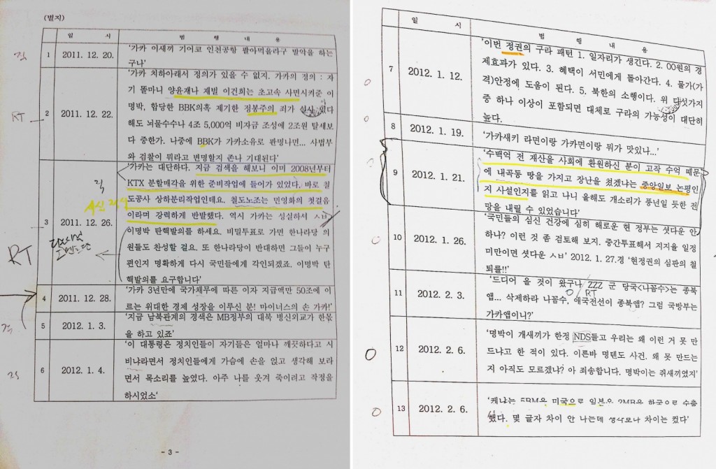 - 7월 17일: 비공개로 진행된 공판준비기일에 군 검찰은 기무사 서 아무개 대위가 작성한 확인서 제출. (링크) 확인서의 내용은 이 대위 트위터 총 473장 출력, 제주 해군기지 논쟁 이전에 대부분 출력되었다는 것.